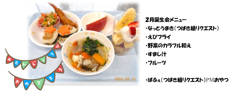 夕⽅延⻑保育は18:50におやつ(果物・お茶など)があります。